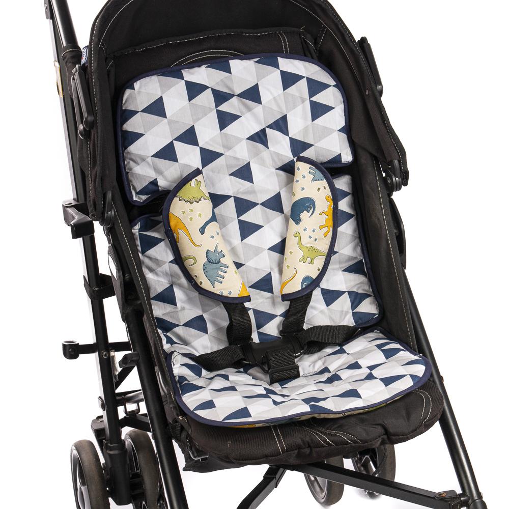 Acompanha dois pares de protetores para cinto, para combinar com as duas faces do produto, deixando assim o carrinho ou bebê conforto ainda mais bonito.
