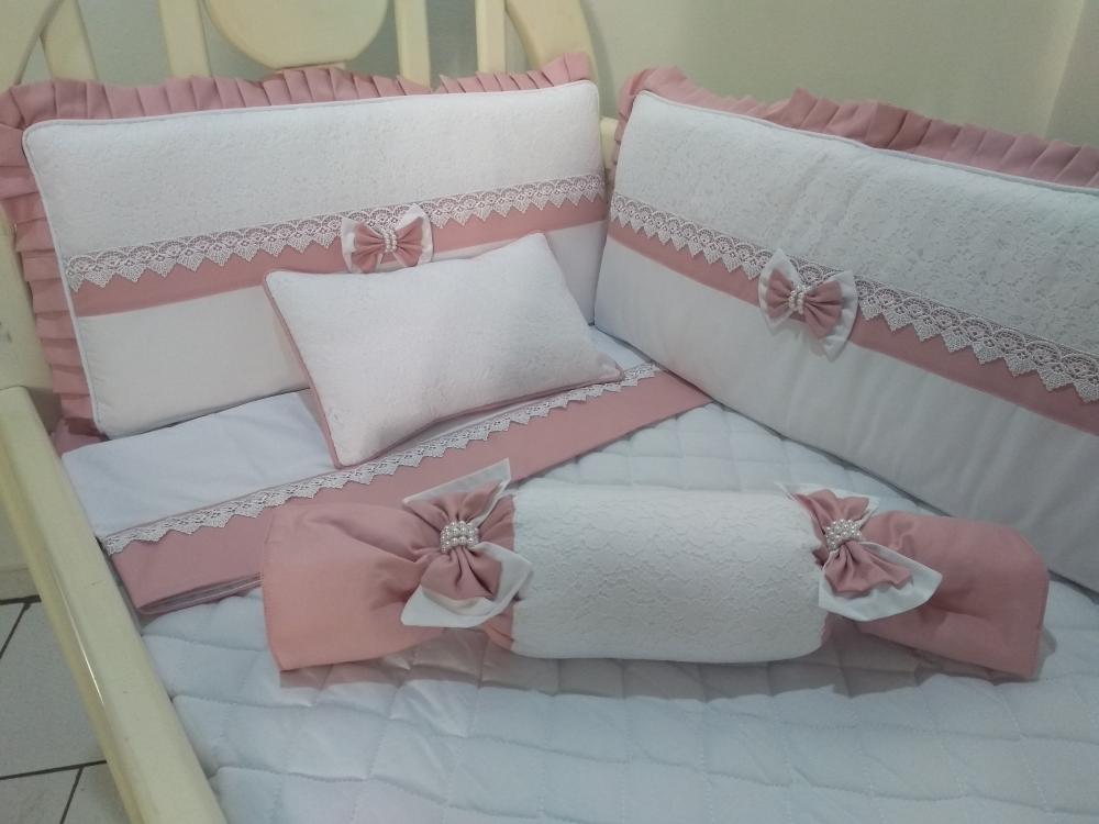 - Jogo de lençol que acompanha o kit confeccionado com tecido branco, com barrado com gripir em tricoline rosê.